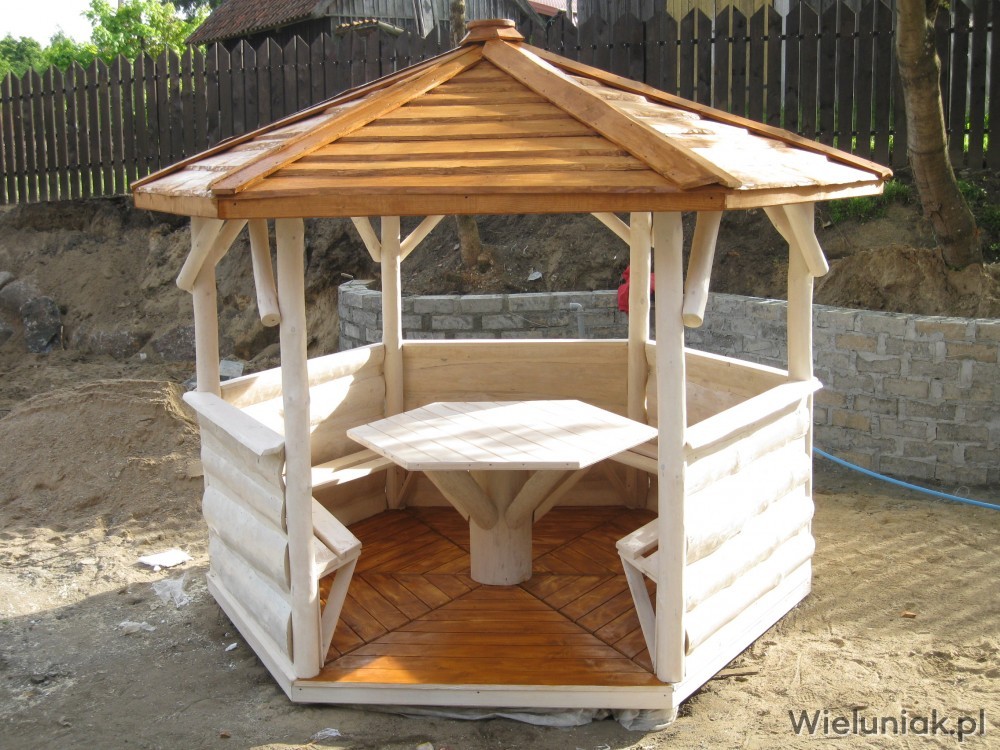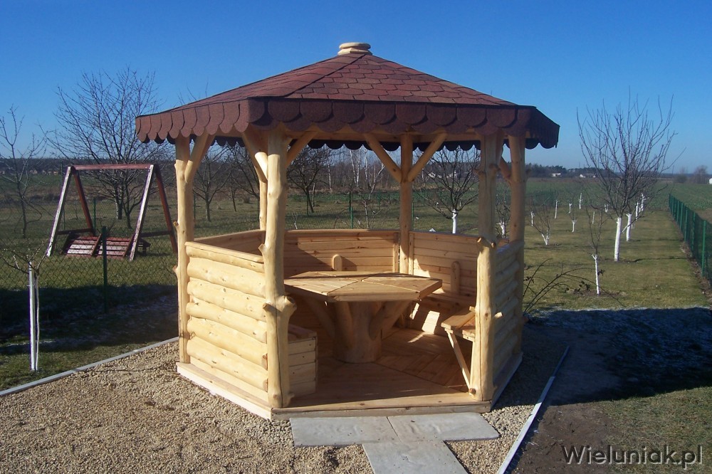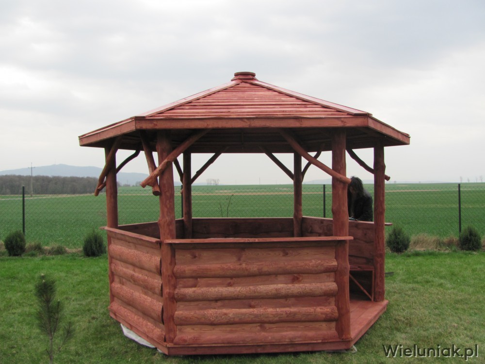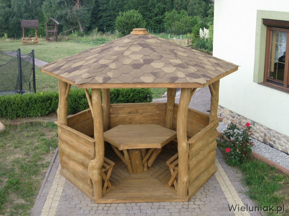 Altany ogrodowe wykonywane są z drewna sosnowego. Każda altana drewniana jest ustawiana na odpowiednio rozmieszczonych i wypoziomowanych podkładach betonowych, które zabezpieczają przed gromadzeniem się wody pod podłogą altany i zapewniają cyrkulację powietrza pod podłogą. Stosujemy również agrowłókninę, której zadaniem jest zapobieganie przerastaniu roślinności między deskami podłogowymi. Słupy altany mają wysokość 200 cm, natomiast całkowita wysokość altany wynosi 270 cm. Dachy altan wykonane są z desek boazeryjnych oraz pokryte gontem bitumicznym co zapewnia długoletnią trwałość każdej altany oraz odpowiednie wrażenia estetyczne. Każda z altan wyposażona jest w zestaw mebli, na który składają się stół z sześciokątnym blatem oraz 5 ławek, zamocowanych do altany. Wszystkie elementy altany są odpowiednio strugane oraz dwukrotnie impregnowane. Na życzenie klienta możemy zamontować w altanie oświetlenie oraz dodatkowe kratownice. Wszystkie altany montujemy samodzielnie. Dostarczamy nasze produkty na terenie Polski oraz zagranicę. Koszty transportu uzgadniamy indywidualnie z każdym klientem.