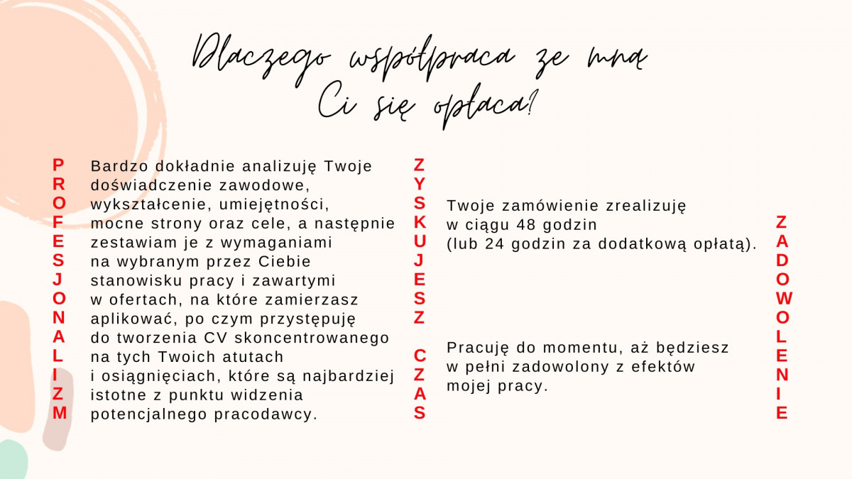 3. Twoje zamówienie zrealizuję w ciągu maksymalnie 48 godzin (24 godzin – za dodatkową opłatą). Otrzymasz CV w formacie pdf oraz CV w wersji edytowalnej, abyś mógł w przyszłości np. dopisać do niego kolejne miejsce pracy lub zdobyte umiejętności.