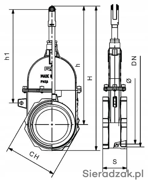 h - Odległość od środka otworu zasuwy do otworu dźwigni (pionowy) - 287 mm