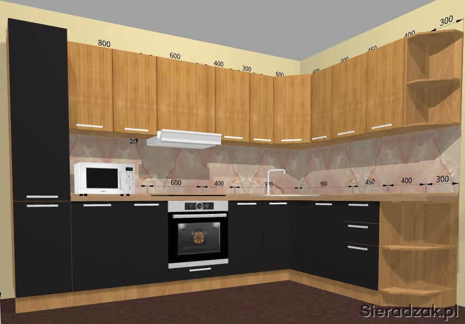 W skład zestawu kuchennego wchodzą blaty o długościach 270cm, 145 cm. Grubość tych blatów wynosi 38 mm.