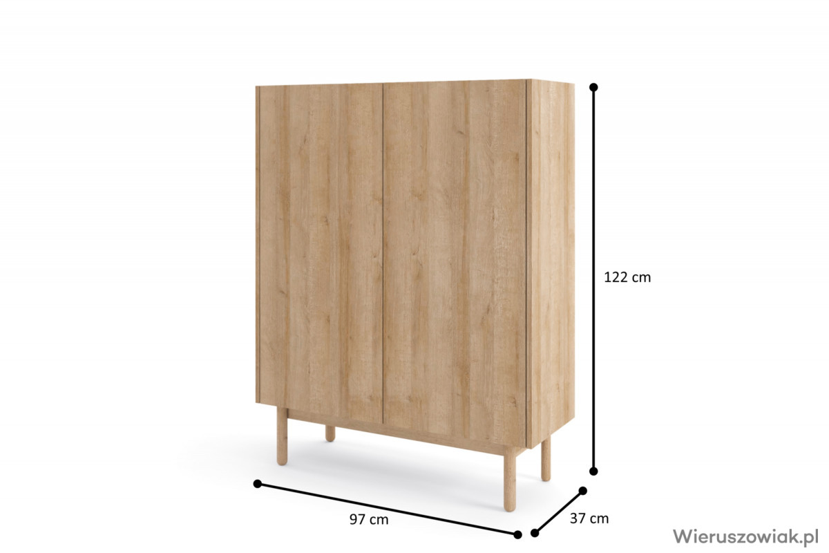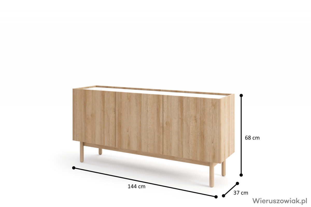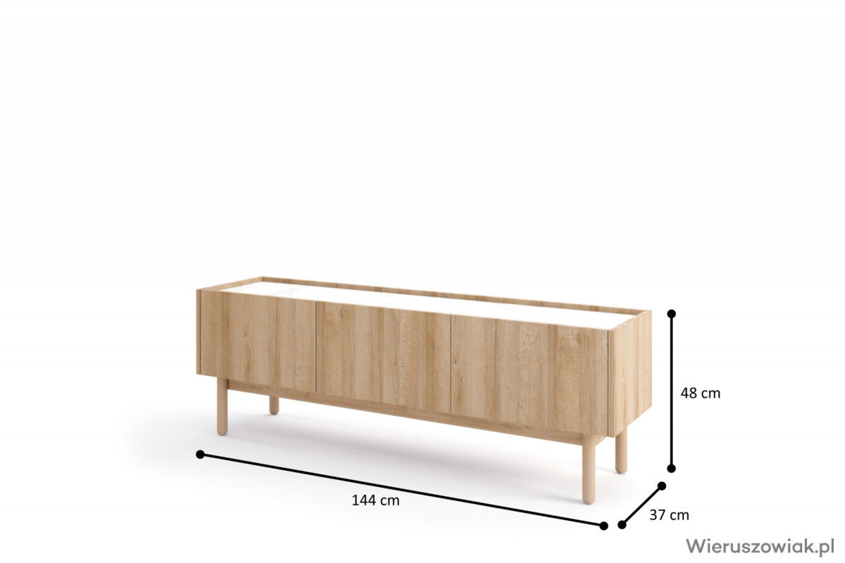 Zestaw mebli do salonu w stylu boho, wykonany w kolorze Riviera/Marmur Bianco, to elegancka i nowoczesna propozycja, która wnosi do wnętrza subtelną harmonię oraz naturalny, przytulny klimat. Meble stoją na wysokich drewnianych nóżkach, co nadaje im lekkości i sprawia, że przestrzeń zyskuje na elegancji. W skład zestawu wchodzi szafka RTV, duża komoda oraz komoda wysoka, które wyróżniają się nie tylko estetyką, ale i funkcjonalnością.