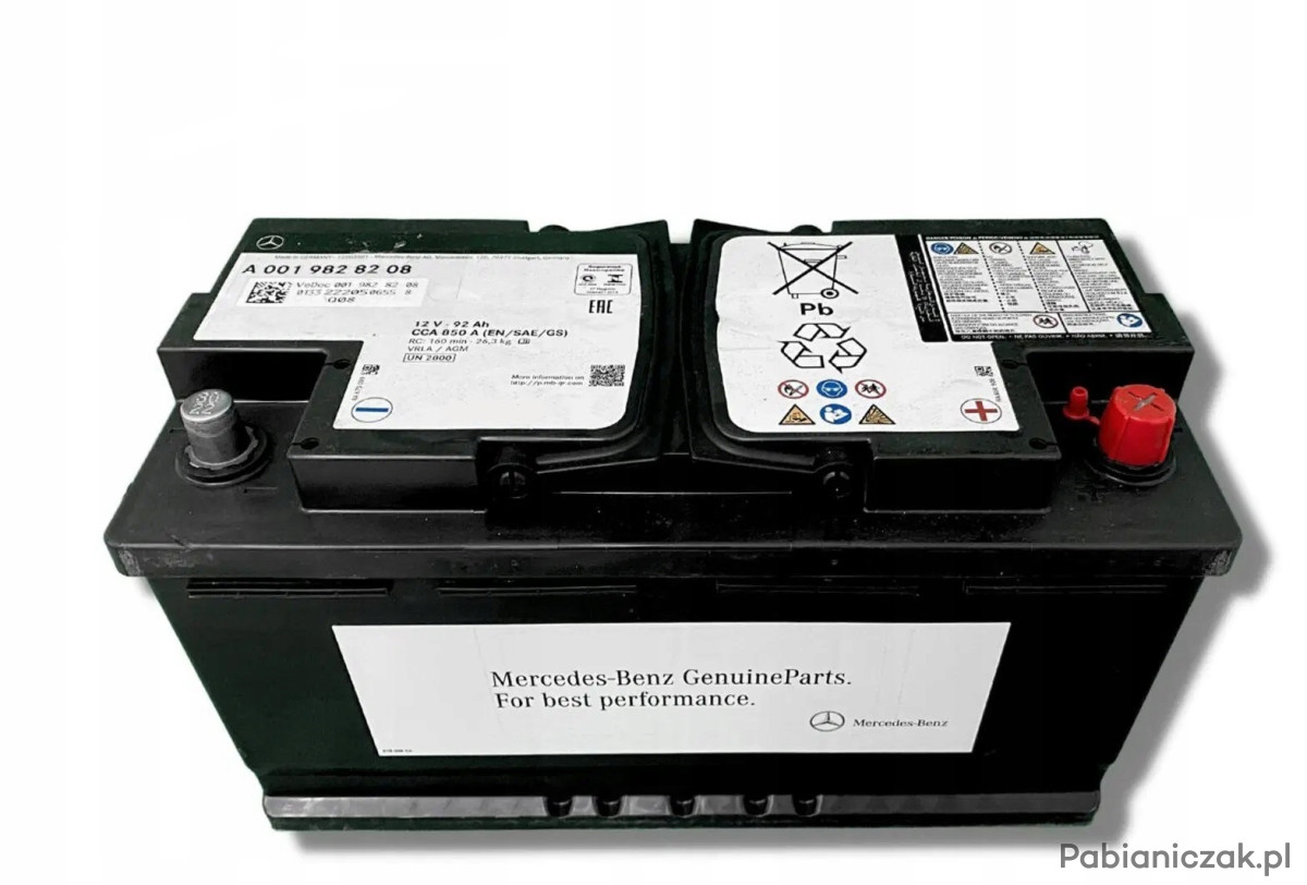 Akumulator A0019828208 (kod producenta) to oryginalna bateria rozruchowa przeznaczona do samochodów marki Mercedes-Benz, wykonana w technologii AGM (Absorbent Glass Mat), stosowana fabrycznie w wielu modelach tej marki.